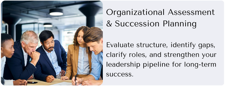 Organizational Assessment & Succession Planning Evaluate structure, identify gaps, clarify roles, and strengthen your leadership pipeline for long-term success.